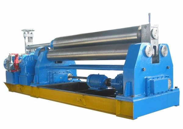 本機(jī)結(jié)構(gòu)型式為三輥對(duì)稱(chēng)式,上輥在兩下輥中央對(duì)稱(chēng)位置作垂直升降運(yùn)動(dòng),通過(guò)絲桿絲母蝸桿傳動(dòng)而獲得,兩下輥?zhàn)餍D(zhuǎn)運(yùn)動(dòng),通過(guò)減速機(jī)的輸出齒輪與下輥嚙合,為卷制板材提供扭矩,本機(jī)床結(jié)構(gòu)緊湊,操作維修方便。