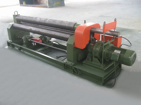 本機結構型式為三輥對稱式,上輥在兩下輥中央對稱位置作垂直升降運動,通過絲桿絲母蝸桿傳動而獲得,兩下輥作旋轉運動,通過減速機的輸出齒輪與下輥嚙合,為卷制板材提供扭矩,本機床結構緊湊,操作維修方便。